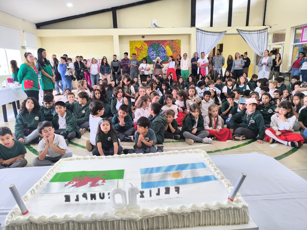 Los festejos finalizaron con el tradicional corte de torta y el canto del feliz cumpleaños en galés, compartido por toda la comunidad educativa.