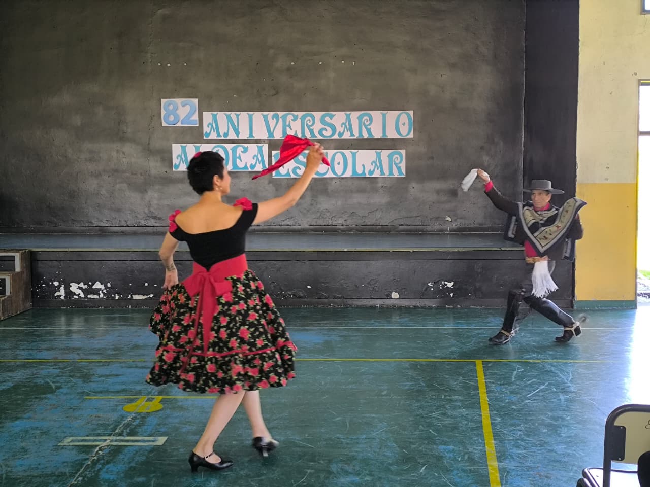 Finalizada la parte protocolar, la jornada continuó con los números artísticos. Pablo Jones y Ailén Jones Jaramillo interpretaron la zamba “La 7 de Abril”, en homenaje a los antiguos pobladores —entre ellos las familias Aguilera y Beroiza, fundamentales en los primeros capítulos de Aldea Escolar—.